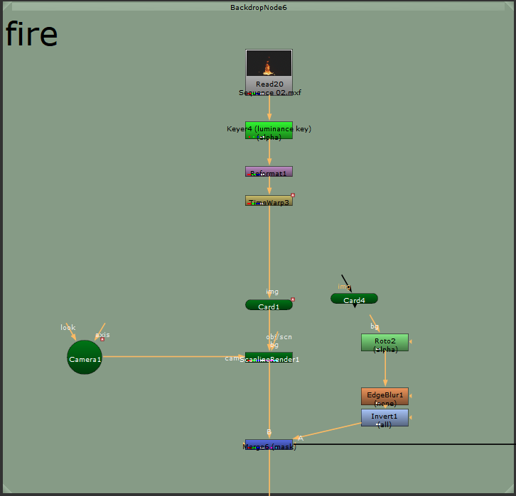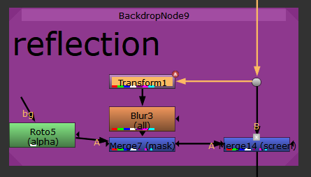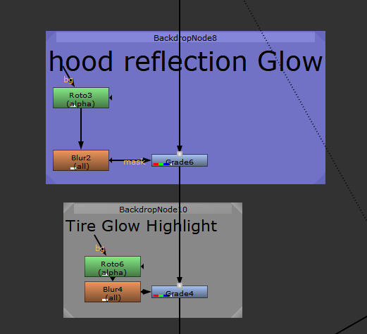 I used a simple transform and screen merge to create a reflection on the top of the car. Additionally, I applied a generic glow with a grade to match the intensity of the flames.